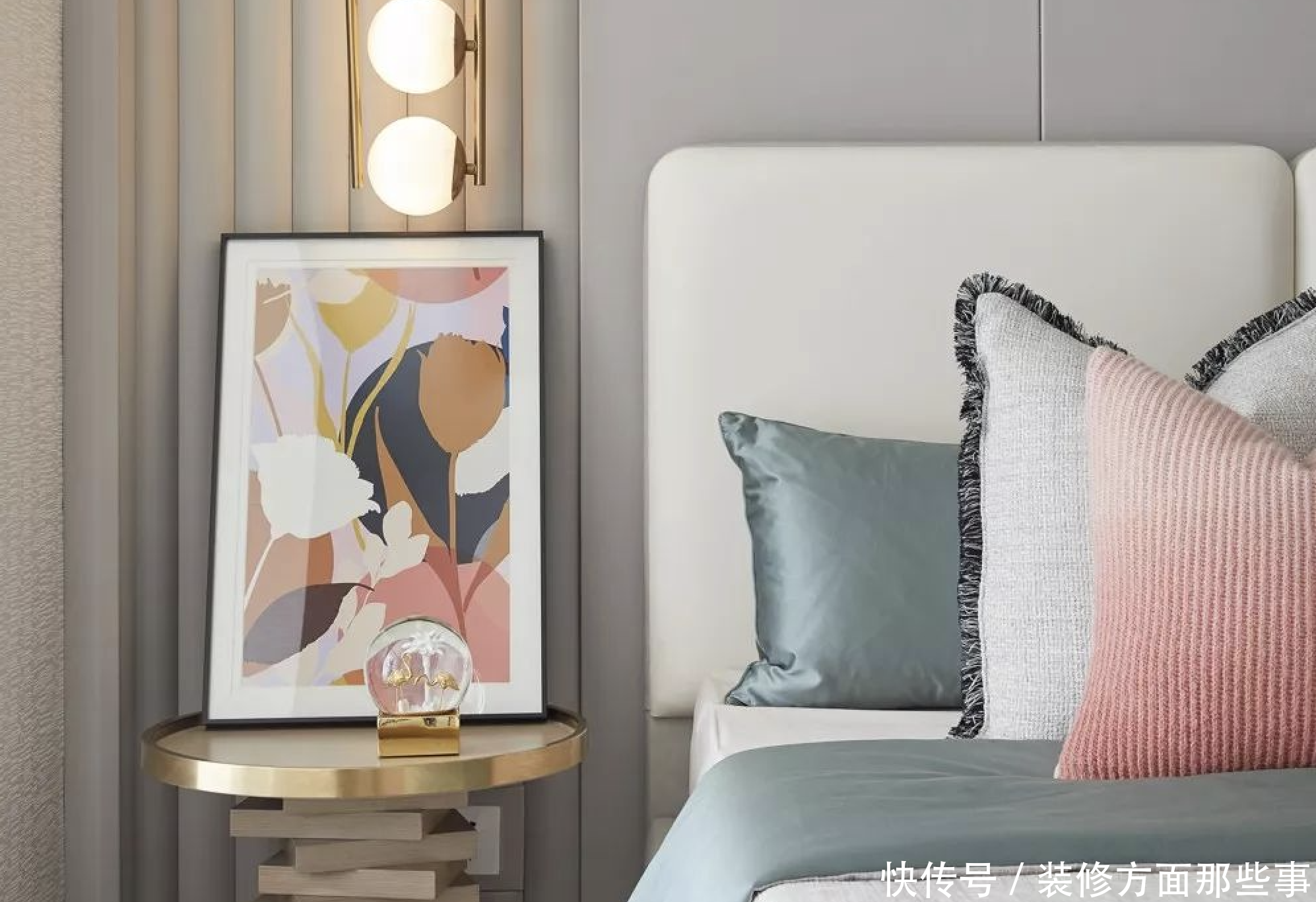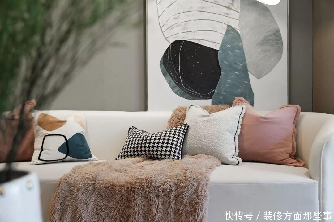 背景墙采用米色系的乳胶漆,加上简单的石膏走线,挂上一幅极富艺术气息的挂画,加上莫兰迪色彩的软装搭配,静谧而舒适。