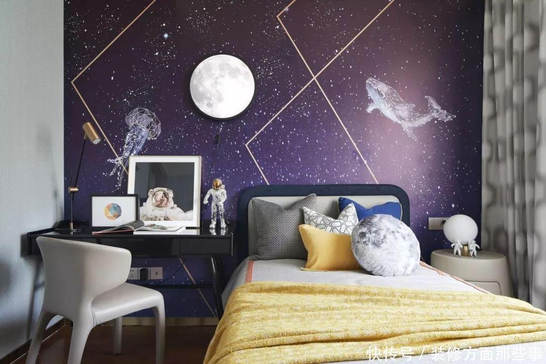 ·儿童房·以漫游太空为主题,背景墙描绘了深邃又神秘的太空宇宙,外星生物的存在好似为孩子们的梦想插上了翅膀,陪伴着孩子慢慢长大。