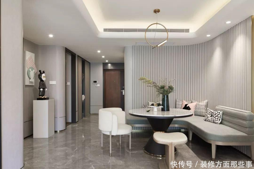 餐厅·采用低调、柔和的淡蓝色来装饰,更能给人一种视觉上的舒适感,安静沉稳、简约雅致的现代气息扑面而来。