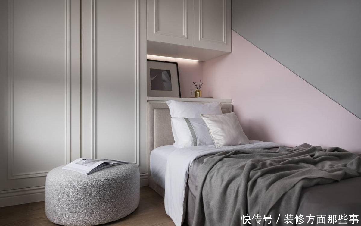 粉嫩恬静寝卧色调延续空间一致的新古典调性,成绮空间设计调和粉色与灰色铺叙女儿房,围塑恬静柔美的寝卧空间